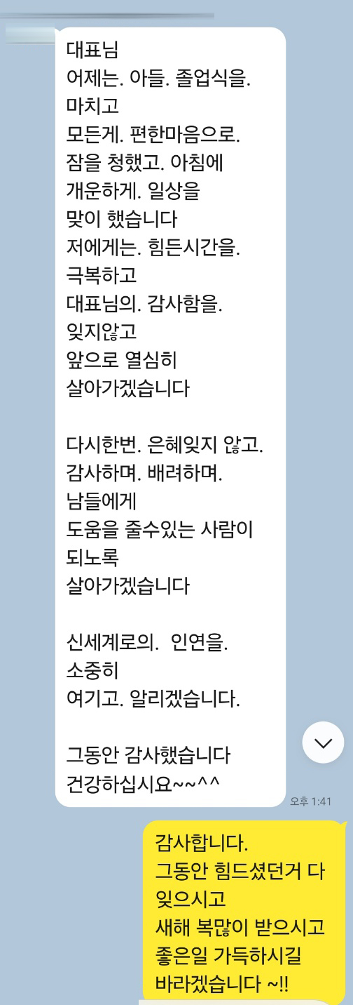 저에게는 힘든 시간을 극복하고 대표님의 감사함을 잊지 않고 앞으로 열심히 살아가겠습니다.
